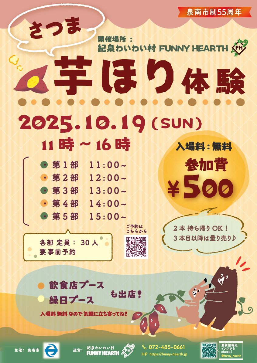 食欲の秋、実りの秋がやってきました! 大阪府泉南市にある当キャンプ場「紀泉わいわい村」では、大人も子供も土にまみれて楽しめる「さつまいも掘り体験」を開催します!